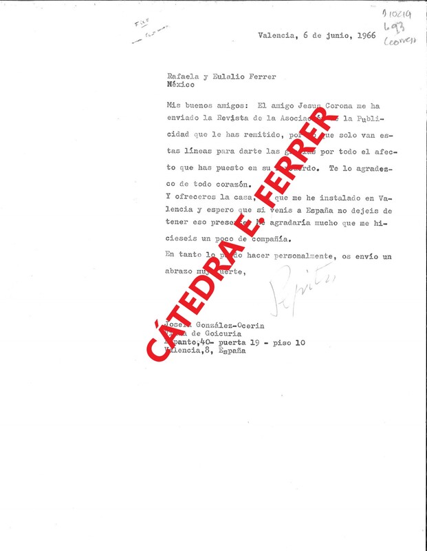 Agradecimiento por mensaje de condolencias a propósito del fallecimiento del sr. Luis. Acusa de recibo a la revista de la Asociación de la Publicidad enviada, a su vez, por el sr. Jesús Corona.